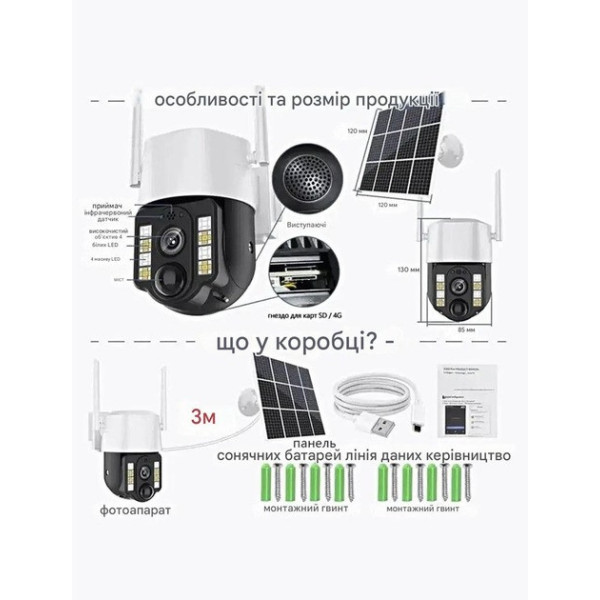 Камера обладнана широким кутом огляду та механізмом повороту: горизонтально 90°, вертикально 120°, що дає змогу контролювати територію на 355°. Висока роздільна здатність Full HD 1080P забезпечує чітке зображення вдень і вночі. Інфрачервона підсвітка та кольорове нічне бачення дають змогу фіксувати події навіть у повній темряві.