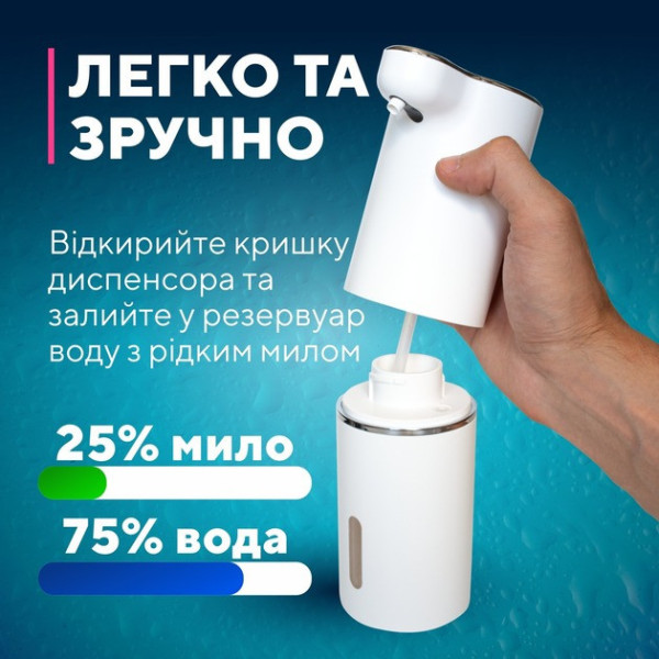 Проста конструкція диспенсера дає змогу розібрати пристрій за кілька секунд, щоб помити місткість. Для заправлення пінного дозатора треба відкрутити кришку та залити засіб. А необхідність заправляння ви побачите крізь прозоре віконце.