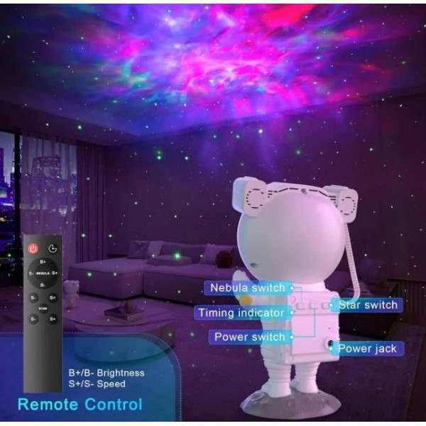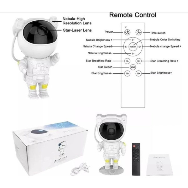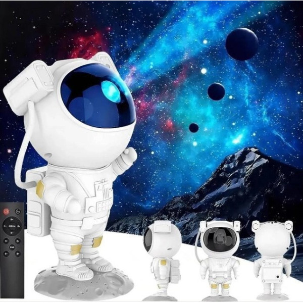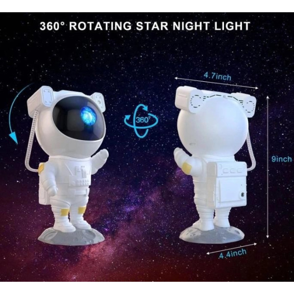 Лазерний проєктор Sky Star Astronaut Lamp у формі астронавта на Місяці перетворює дитячу кімнату на казкову галактику. Восьмиколірні зображення зоряного неба створюють ефект, що зачаровує світловий ефект, який підходить для сну, ігор, вечірки або сімейного кіно. Рухливість астронавта дає змогу регулювати напрямок проекції, змінюючи положення рук і нахил голови, щоб зірки висвітлювали саме ту частину кімнати, яку ви хочете.
