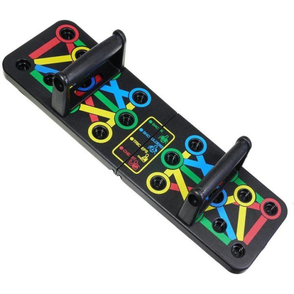 Різні кольори поєднують в собі тренування різних частин тіла: сині частини тренують груди, зелені частини тренують трицепси, червона частина-це вправа на плечі. Після використання він складається і блокується і відразу ж перетворюється в компактний чемодан, який може зберігатися в будь-якому куточку будинку.