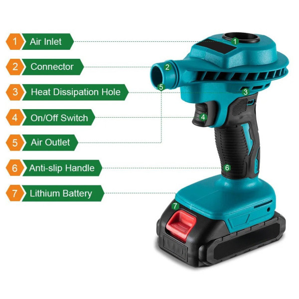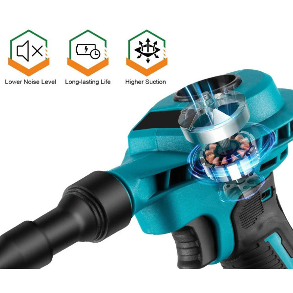 Потужний потік повітря до 200 м/с дає змогу ефективно справлятися з прибиранням на вулиці та в приміщенні: сад, двір, гараж, тераса, майстерня. Ергономічний дизайн і невелика вага роблять повітродувку зручною в експлуатації, а низький рівень шуму та брак шкідливих викидів — безпечною й екологічною альтернативою бензиновим моделям.