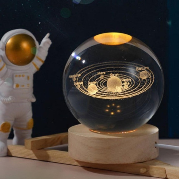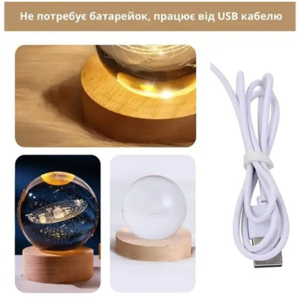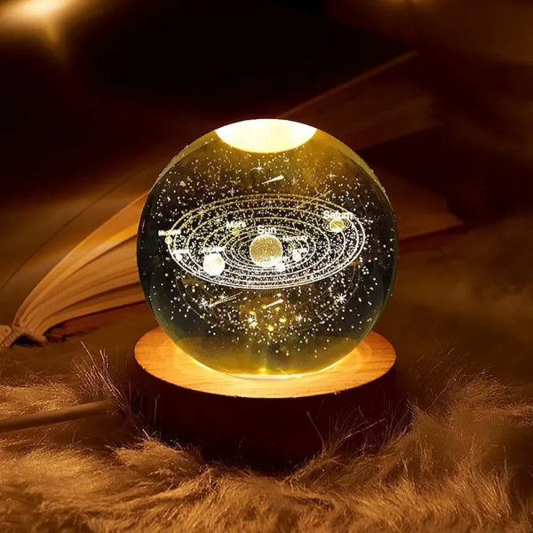 3D-нічник у формі кришталевої кулі із зображенням сонячної системи поєднує функціональність і стиль. Світлодіодна підсвітка м'яко розсіюється через скло, створюючи тепле затишне освітлення, яке допомагає розслабитися й створює атмосферу спокою в кімнаті.