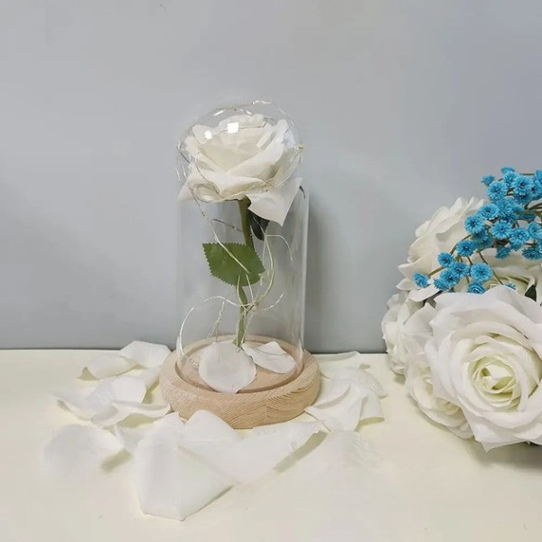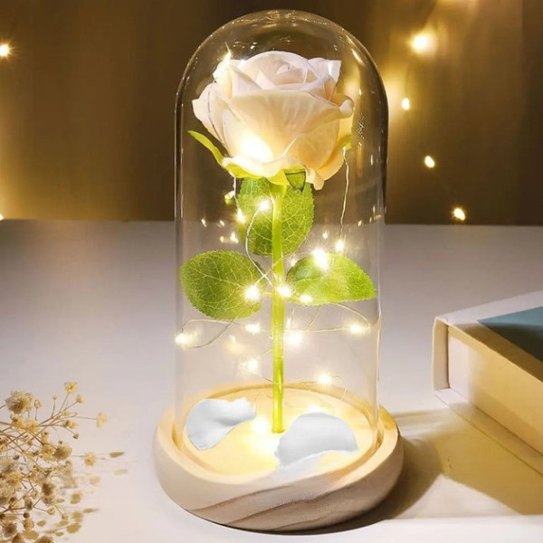 Світлодіодний нічник «Роза в колбі» — це стильний декоративний світильник, що створює атмосферу затишку та романтики в будь-якому приміщенні. Біла троянда в прозорій скляній колбі м'яко підсвічується LED-лампою, випромінюючи тепле світло, яке ідеально підходить для спальні, дитячої або вітальні.