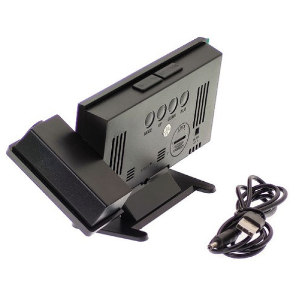 Функції: будильник, календар, термометр, проєктор, пам'ять, нічний режим, регулювання яскравості