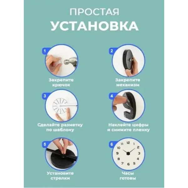 Комплектація: стрілки, циферблатні наклейки, центральний механізм, шаблон для розмітки, інструкція