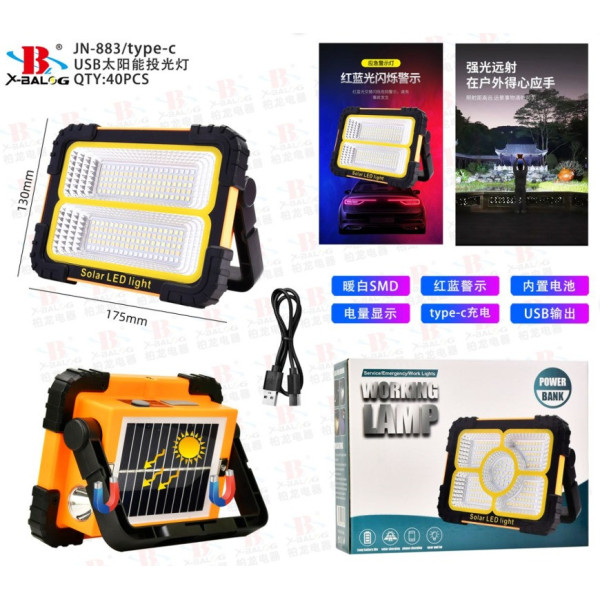 Корпус виготовлений із міцного пластику та забезпечений зручною ручкою для перенесення. Ліхтар живиться від вбудованого акумулятора 3600 мА·год, який можна зарядити як від мережі 220 В, так і від сонячної панелі, вбудованої на зворотному боці прожектора. На задній панелі розташований USB-порт для підзаряджання мобільних пристроїв, що робить ліхтар ще універсальнішим.