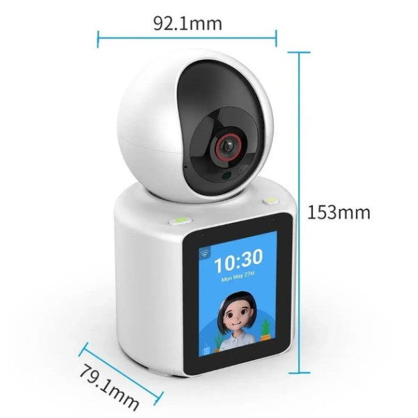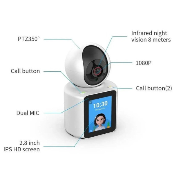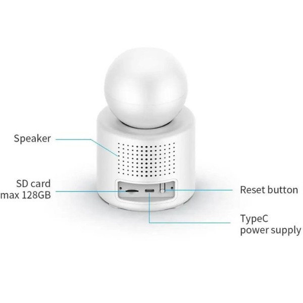 Кімнатна відеокамера обладнана механізмом, що крутиться PTZ, який дає змогу повертати та нахиляти об'єктив, у такий спосіб неабияк збільшуючи огляд для запису або перегляду відео. IP-камера з можливістю віддаленого перегляду та записування відео зі звуком на мобільні пристрої (iOS або Android), а також за допомогою персонального комп'ютера.