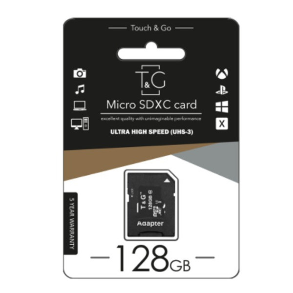 Картка пам'яті T&G MicroSDXC 128 GB Class 10 з адаптером — це оптимальне рішення для зберігання фото, відео та інших файлів. Висока продуктивність забезпечує швидкий запис і читання даних, що ідеально підходить для смартфонів, планшетів, екшн-камер, відеореєстраторів, дронів, фотоапаратів та інших пристроїв.