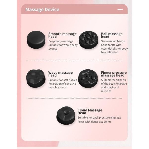 - Масажна насадка з пальцевого тиску: Підходить для всіх частин тіла, розслабляє й допомагає у формуванні м'язів.