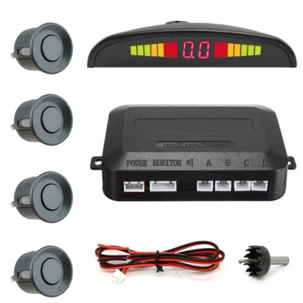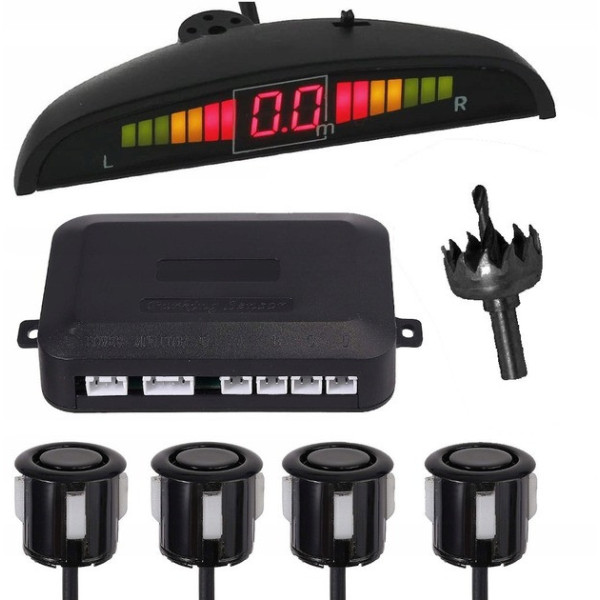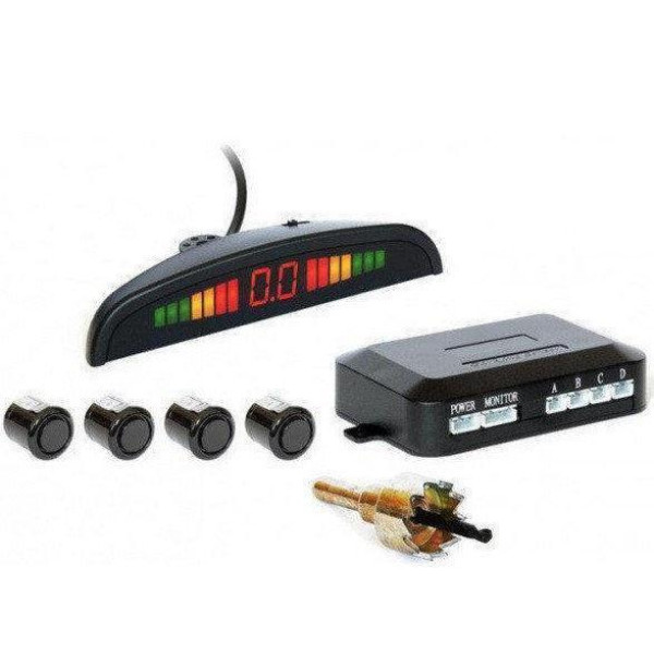 Паркувальна система Car Radar Parking — пристрій, який допомагає безпечно та швидко паркувати автомобіль навіть в обмеженому просторі. Система містить 4 чорних датчики, блок керування та LED-дисплей для візуальної та звукової індикації перешкод.