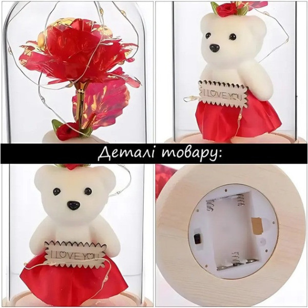 Подарунковий нічник "I Love You" у формі троянди в скляній колбі з милим ведмежам і сердечком — це не тільки джерело м'якого світла, але й стильний елемент декору. Такий сувенір ідеально підходить для подарунка дівчині, дитині або близькій людині.