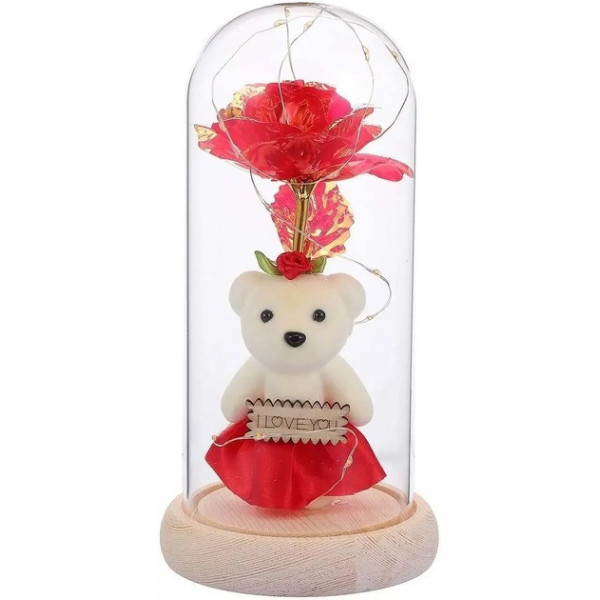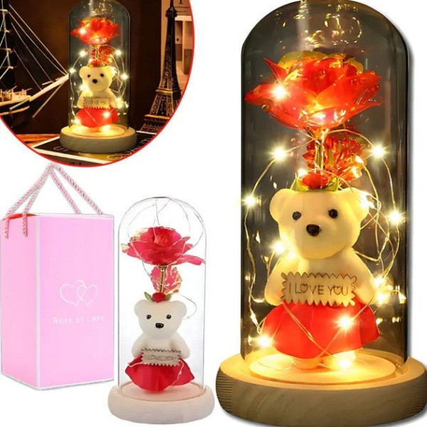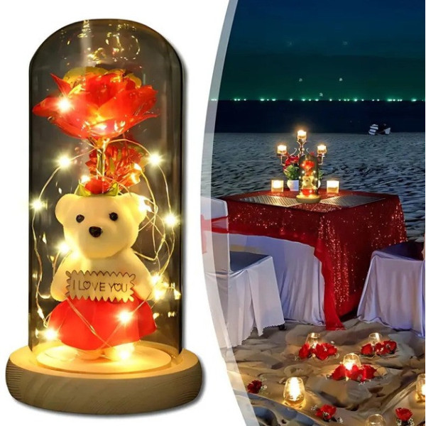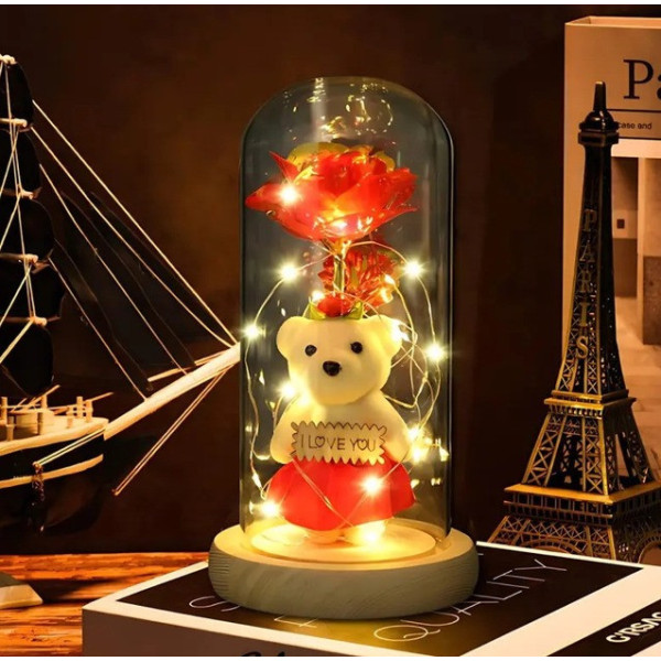 Унікальний дизайн — троянда та ведмедик у скляній колбі мають стильний та вигляд, перетворюючи нічник на гарний декоративний елемент.