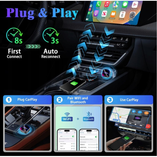 Превращает проводной CarPlay в беспроводной без сложной настройки