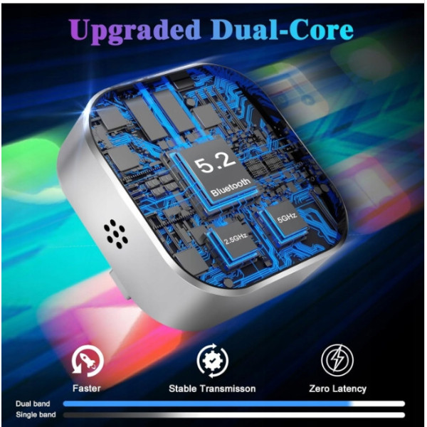 Устройство оснащено усовершенствованной системой Bluetooth 5.2 и двухдиапазонным модулем Wi-Fi (2,4 ГГц + 5,8 ГГц), что гарантирует стабильное и быстрое соединение, минимальные задержки и мгновенную реакцию. После первичной настройки адаптер автоматически подключается к вашему при каждом запуске автомобиля, обеспечивая удобство и экономию времени.