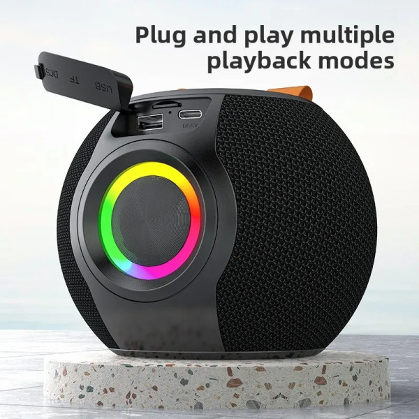Колонка поддерживает различные источники воспроизведения: потоковое подключение через Bluetooth, карта TF, USB-накопитель или FM-радио, что позволяет слушать любимую музыку в любом месте, даже без интернета.