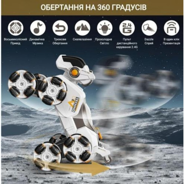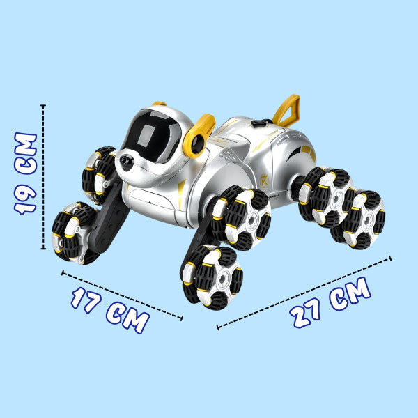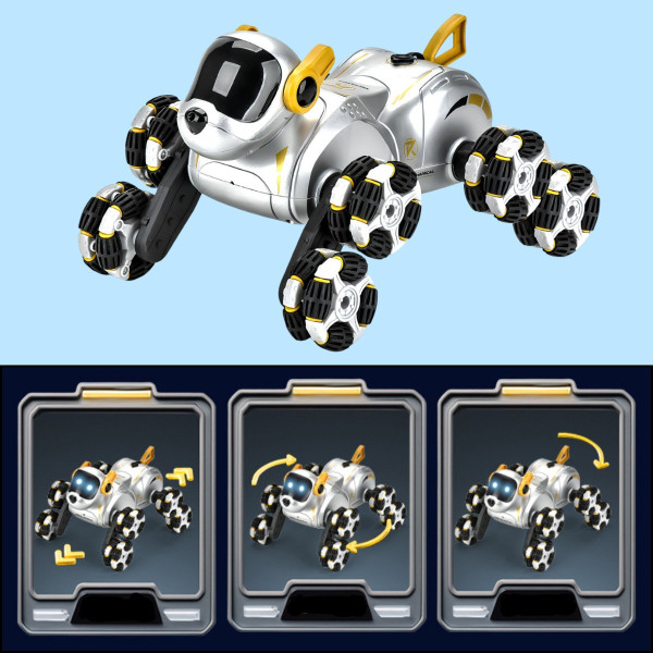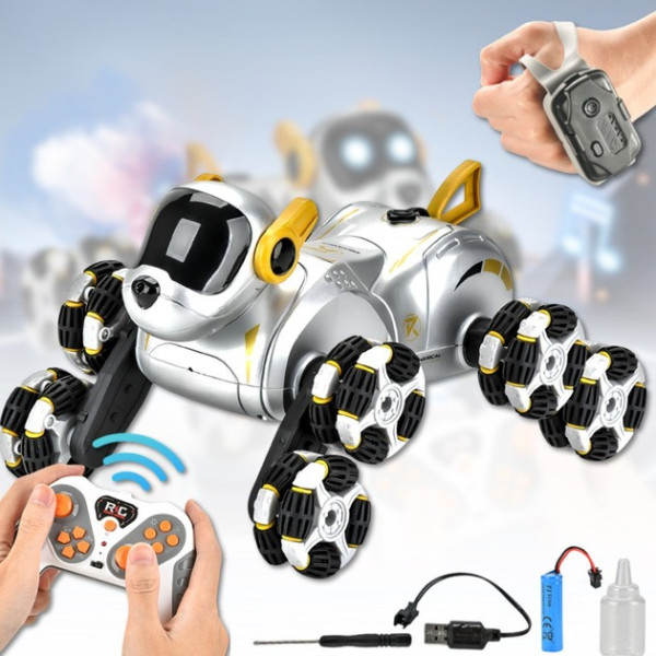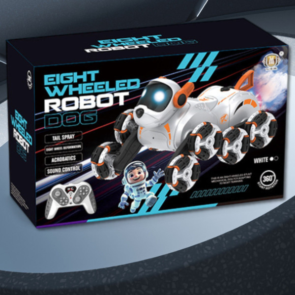 Радиоуправляемый робот-собака Eight Wheeled ROBOT DOG — это современная интерактивная игрушка нового поколения, которая объединяет в себе технологии, движение и увлекательную игру. Робот управляется двумя способами — с помощью пульта дистанционного управления и браслета, реагируя на команды и жесты.