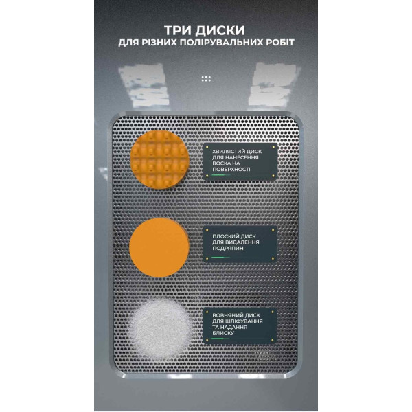 Машинка оснащена мощным мотором и комплектом из трех сменных дисков разной абразивности, что позволяет легко справляться с различными дефектами лакокрасочного покрытия. Легкая и компактная конструкция делает устройство удобным для использования и хранения, включая багажник автомобиля.