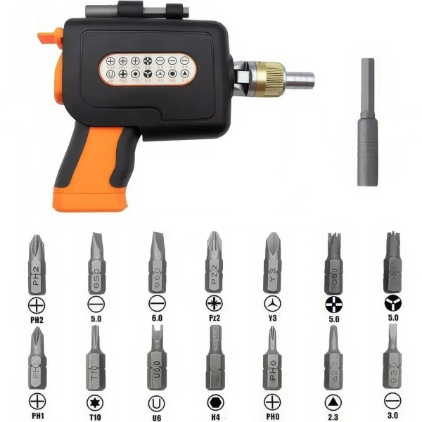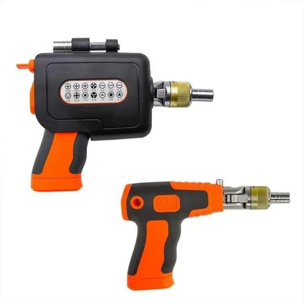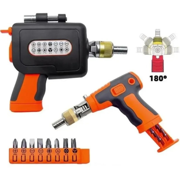 Многофункциональная отвертка 2882A — это универсальный инструмент, разработанный для удобной и быстрой работы с различными типами крепежа. Ее пистолетная форма и храповой механизм делают процесс завинчивания и отвинчивания максимально легким и комфортным. Удобный механизм вращения головки на 180° позволяет без труда работать даже в труднодоступных местах, а магнитные наконечники предотвращают потерю болтов и шурупов.