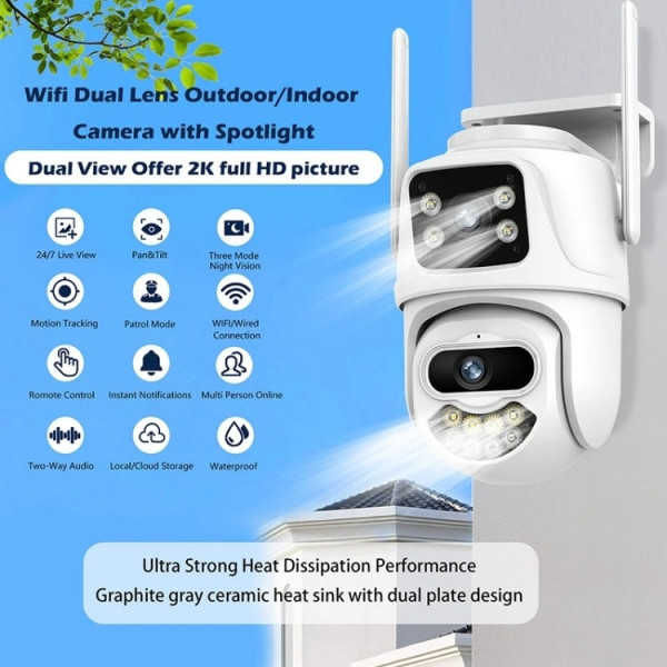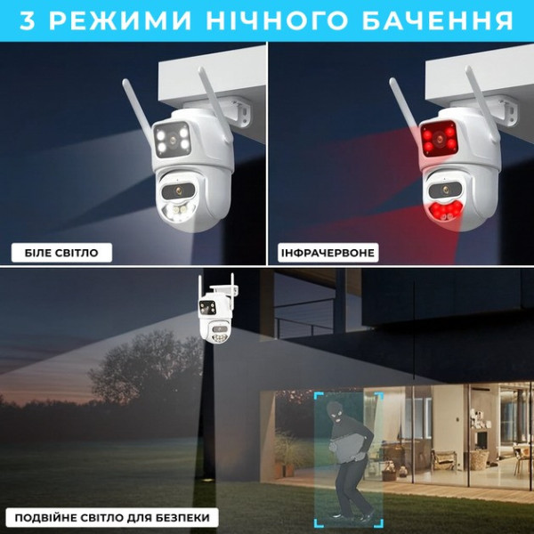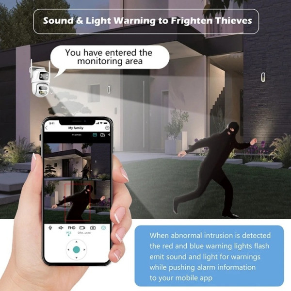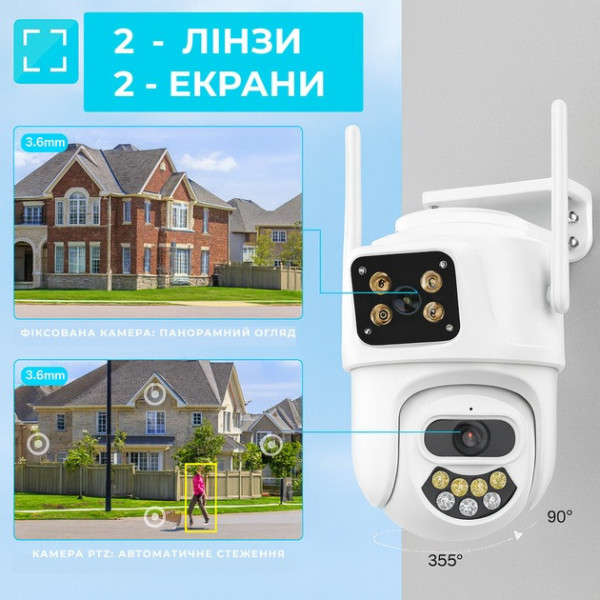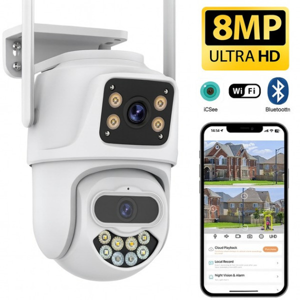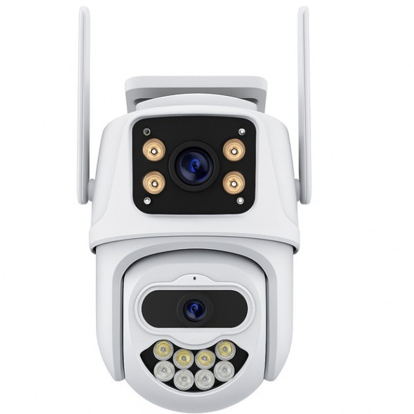 Уличная Wi-Fi IP-камера ICSEE 8MP PTZ — это современное решение для надёжной охраны дома, офиса или бизнеса. Она объединяет в одном корпусе фиксированную камеру и поворотную PTZ-модель, обеспечивая полный обзор территории без слепых зон. Верхний объектив фиксирует выбранную область, а нижний автоматически поворачивается за движущимся объектом, гарантируя максимальный контроль.