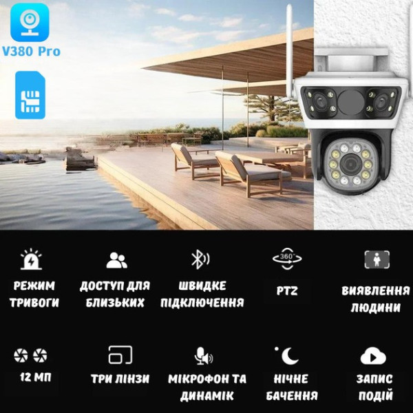 Камера поддерживает Wi-Fi, LAN и 4G, что делает её универсальной для установки в любых условиях: дома, на даче, в офисе или на складе. Подключение к приложению V380 Pro даёт возможность управлять устройством удалённо, получать уведомления о движении и просматривать видеопоток в реальном времени с телефона.