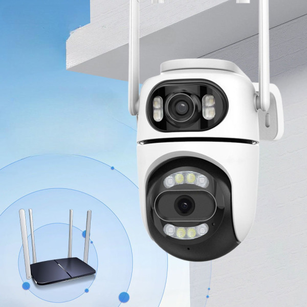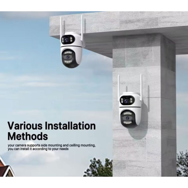 Уличная беспроводная Wi-Fi IP камера PTZ с двумя объективами — идеальное решение для безопасного и удобного видеонаблюдения за домом, дачи, гаражем или парковкой. Данная камера заменяет сразу две-три обычные стационарные камеры благодаря встроенному двойному модулю: одна камера стационарная, вторая поворотная.