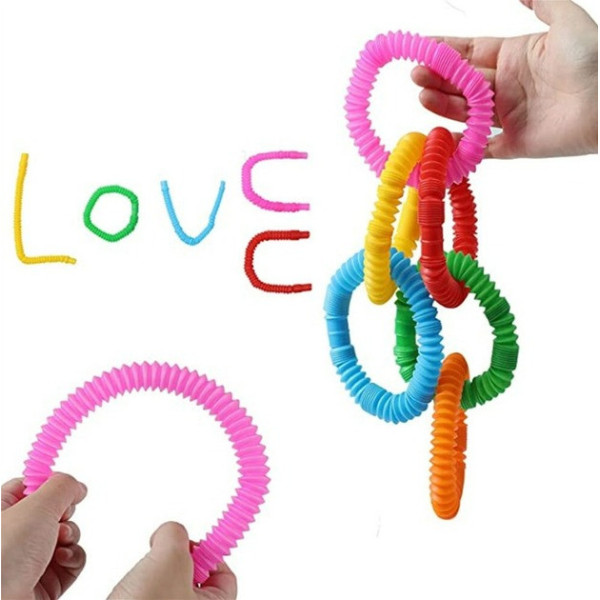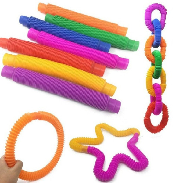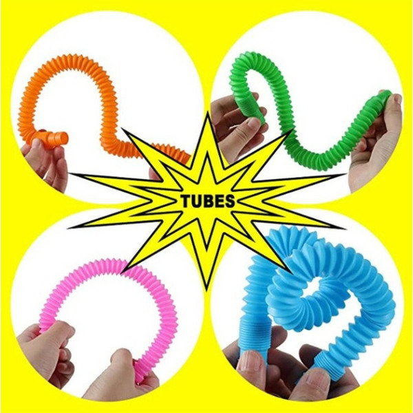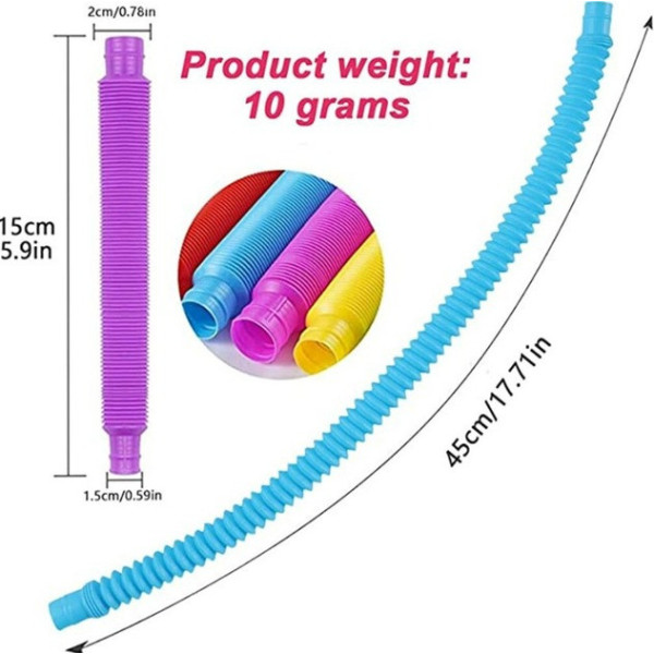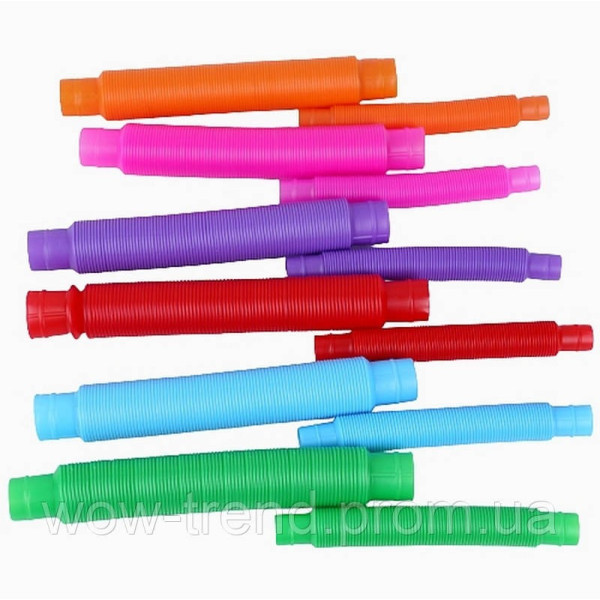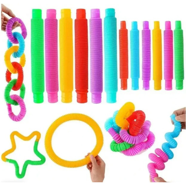 Іграшки Pop Tube — це комплект з 12 гнучких різнобарвних трубок, які сприяють сенсорному, моторному та когнітивному розвитку дитини. Кожна трубка легко розтягується, згинається, з'єднується між собою та видає характерний клацальний звук, стимулюючи слух і дотик.