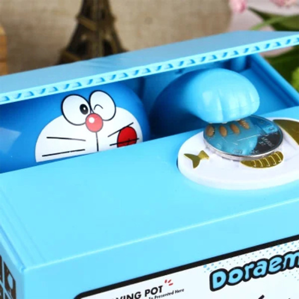 Скарбничка дитяча для монет стане яскравим і захопливим доповненням до будь-якої дитячої кімнати. Цей милий кіт привертає увагу своїм креативним дизайном і реалістичними рухами. Просто покладіть монету на тарілочку, і кіт Дораемон, відкриваючи кришку, забере її всередину скарбнички. Цей кумедний і безпечний спосіб зібрати гроші ідеально підходить для дітей. Він допомагає формувати фінансову грамотність, перетворюючи процес накопичення на захопливу гру.