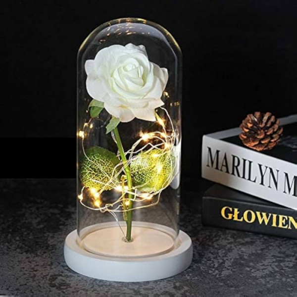 Троянда біла декоративна в скляній колбі з LED-підсвіткою й батарейками