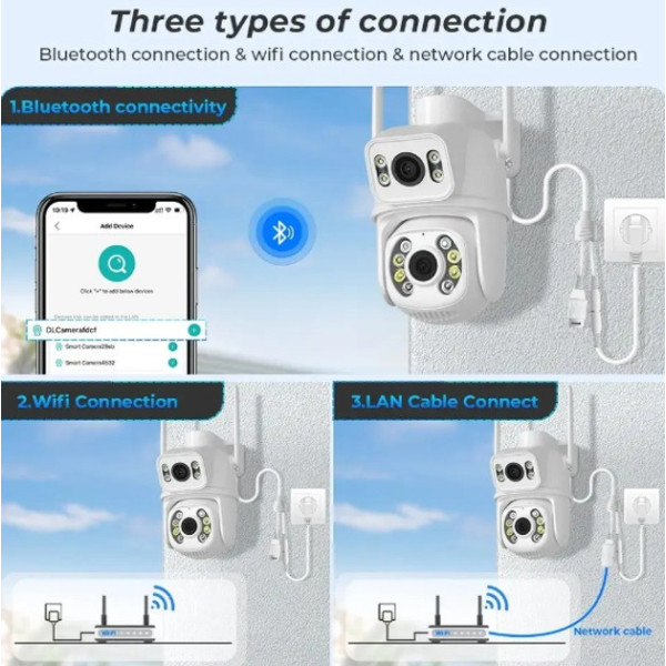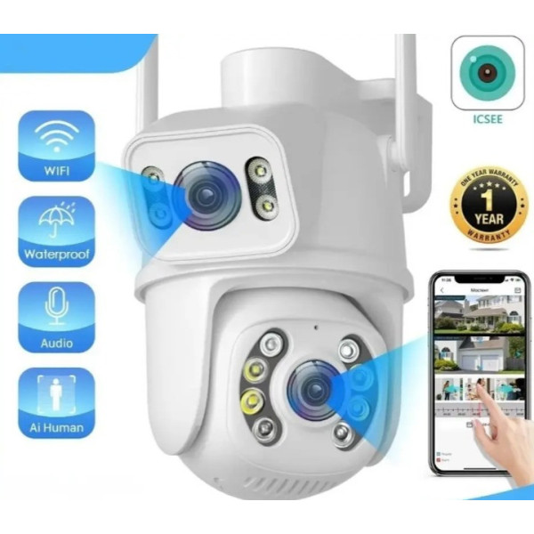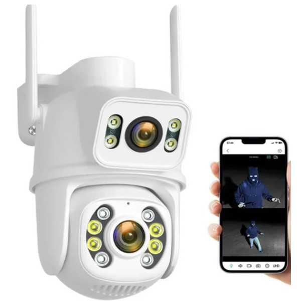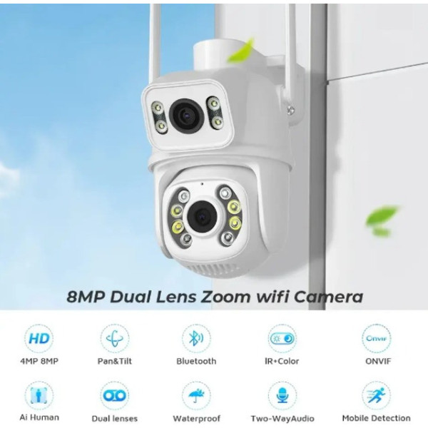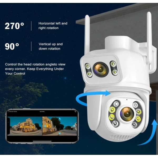 Роздільна здатність 8MP = 4 Мр (лінза 3,6 мм) + 4MP (лінза 3,6 мм), поворот по горизонталі 270° по вертикалі 90°, режим день-ніч, режим моніторингу та записування на карту до 128 МБ через рух, двобічний звук.