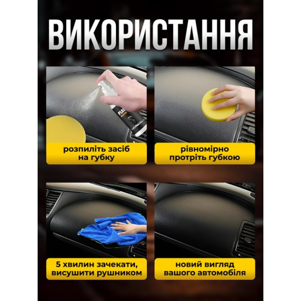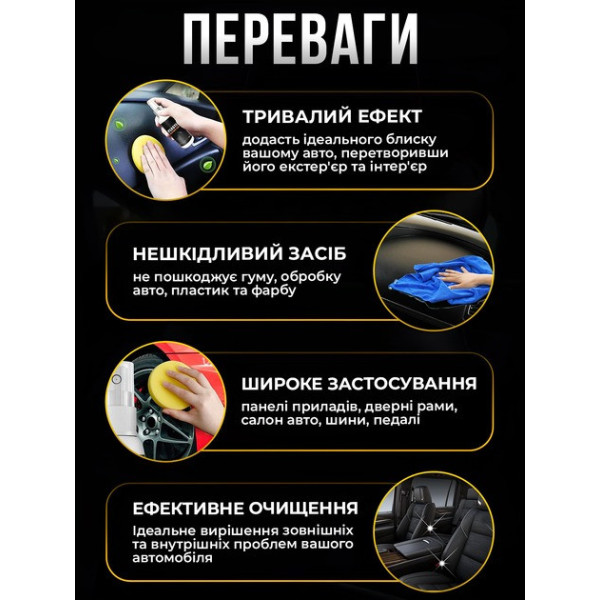 Продукт підходить як для внутрішніх елементів салону — панелі приладів, дверні панелі, сидіння, так і для зовнішніх пластикових деталей — арок коліс та інших елементів. Формула на основі силіконової олії та компонентів з догляду забезпечує довгостроковий ефект, не залишає жирних слідів і не притягує пил.