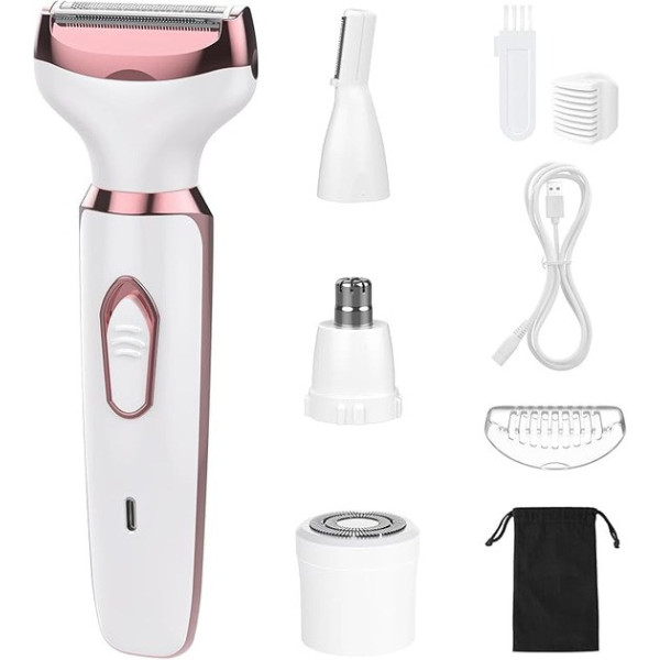 Епілятор обладнаний чотирма насадками: для корекції брів і обличчя, для видалення волосся в носі та вухах, для гоління зони бікіні та класичної епіляції ніг і тіла. Такий набір робить прилад максимально практичним і зручним, даючи змогу використовувати його для різних ділянок шкіри.