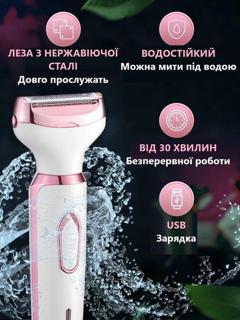 Насадки: тример для обличчя та брів, насадка для носа та вух, насадка для зони бікіні, епілятор для ніг і тіла